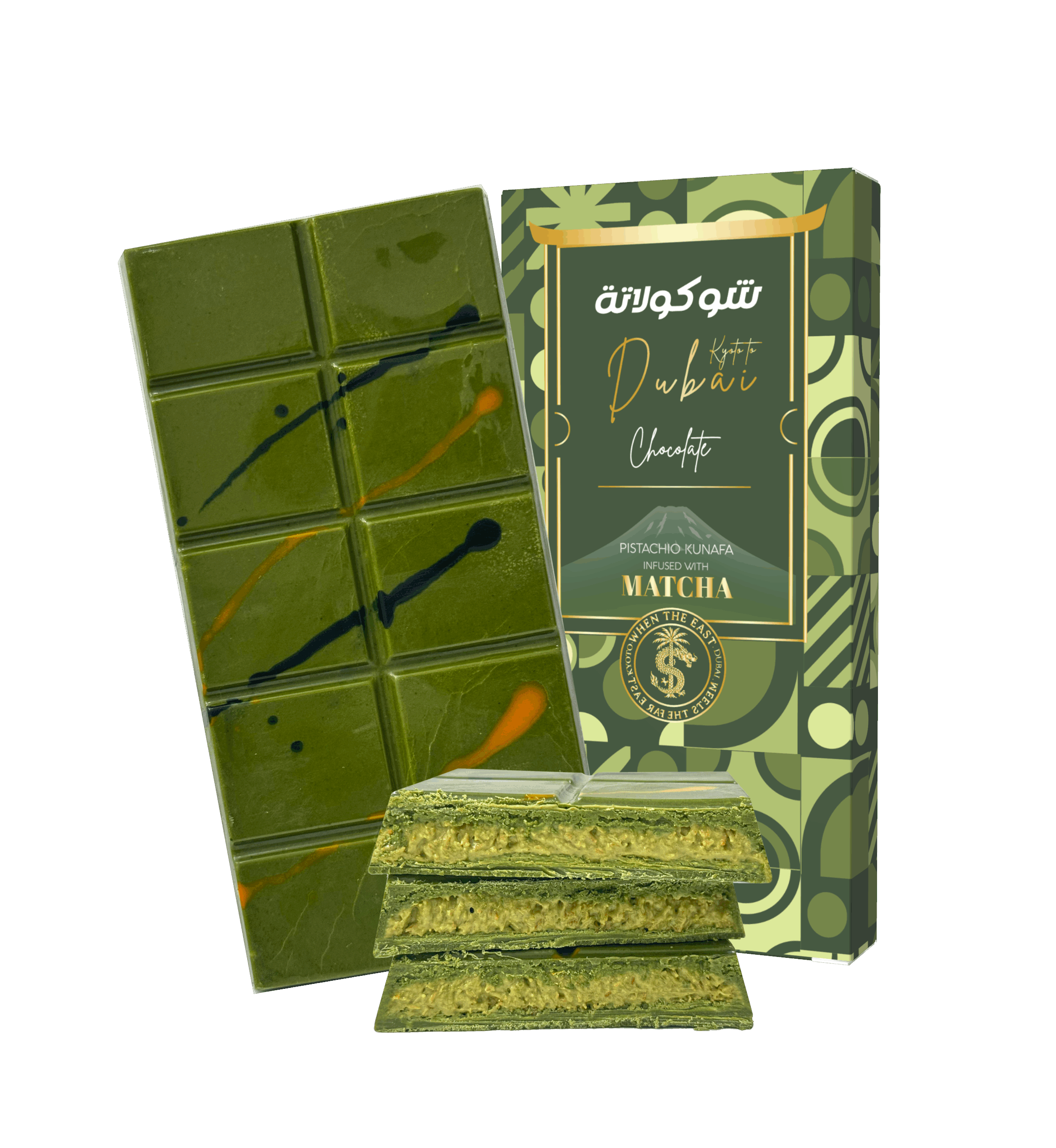 White chocolate infused with matcha, filled with pistachio cream and kunafa, 200g. Shop now at Ledamas UAE.